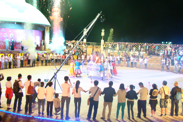 和观众一起围绕着篝火欢快的挑起安代舞;
